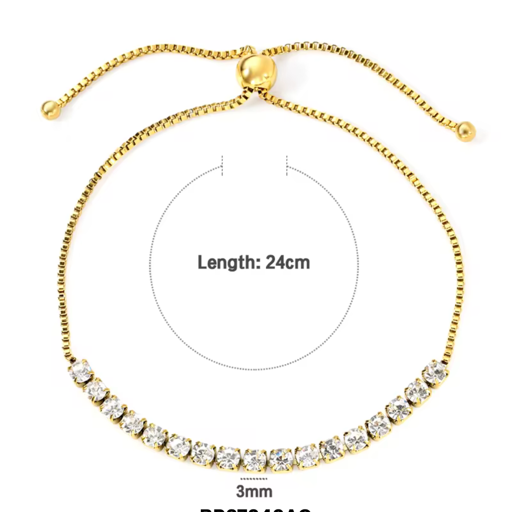 Brățara este realizată din oțel inoxidabil cu finisaj gold, având un design elegant accentuat de un șir de pietre strălucitoare aplicate cu atenție. Liniile curate și detaliile fine oferă un aspect sofisticat, perfect pentru un stil feminin și modern.